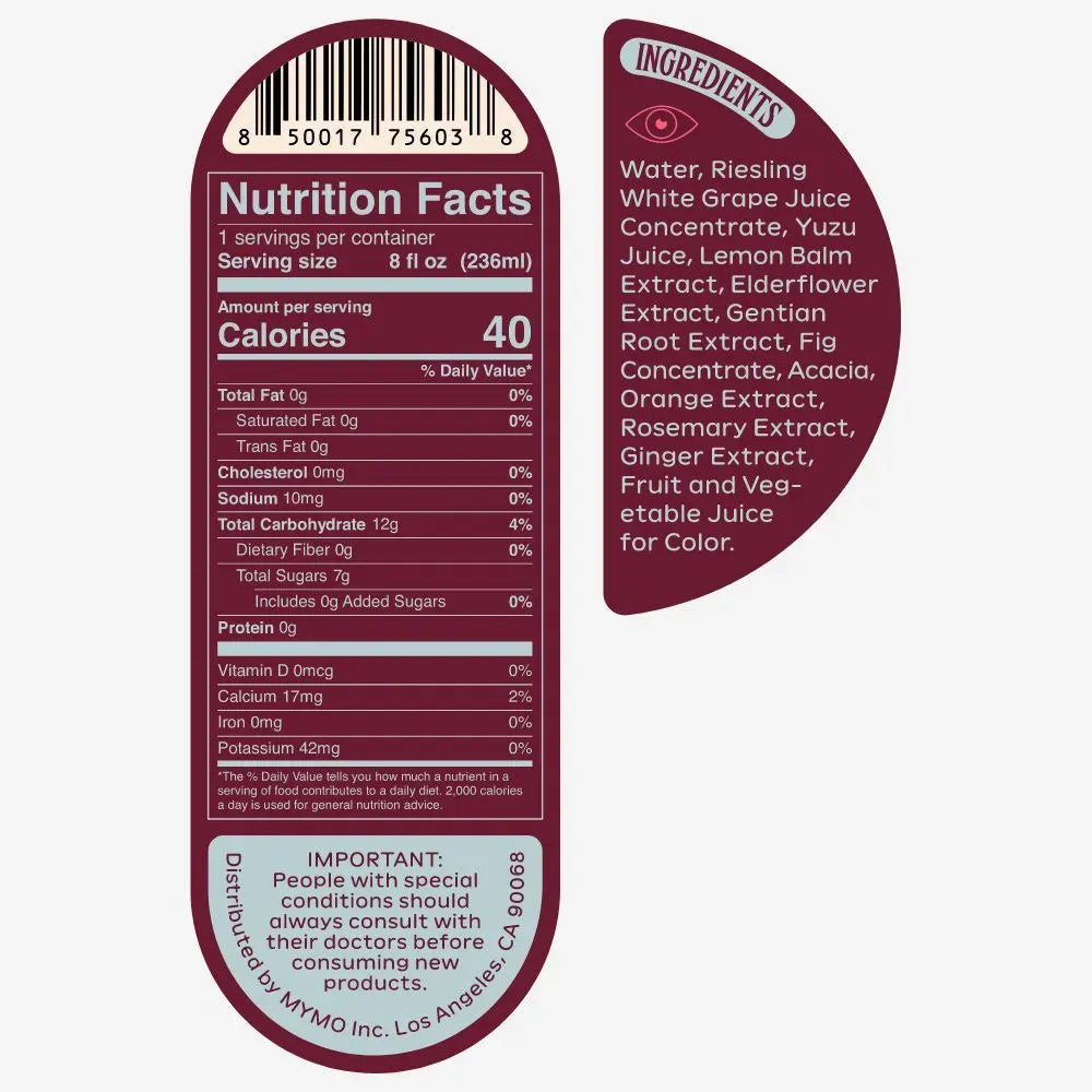Water, Riesling White Grape Juice Concentrate, Yuzu Juice, Lemon Balm Extract, Elderflower Extract, Gentian Root Extract, Ginger Juice, Fig Concentrate, Orange Peel Extract, Rosemary Extract, Acacia, Ginger Extract, Fruit and Vegetable Juice for Color.